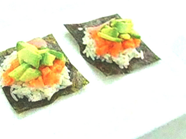 Рецепт суши с авокадо.Состав:нори — 3 листа;рис — 70 гр;сок одного лимона;оливковое масло — 2 столовых ложки;сахар — 2 столовых ложки;авокадо — 1/4;морковь — 1 штука;розовая вода, имбирь, соль.